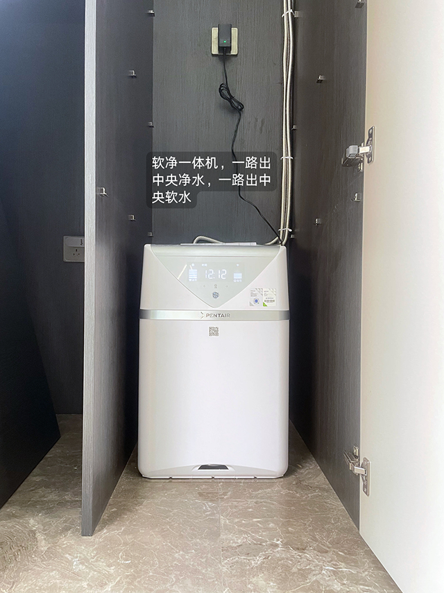 第三步:中央凈水機(jī)出來的水分兩路走,一路進(jìn)到廚房、吧臺,還可以再接廚下直飲機(jī);另一路進(jìn)到中央軟水機(jī)。